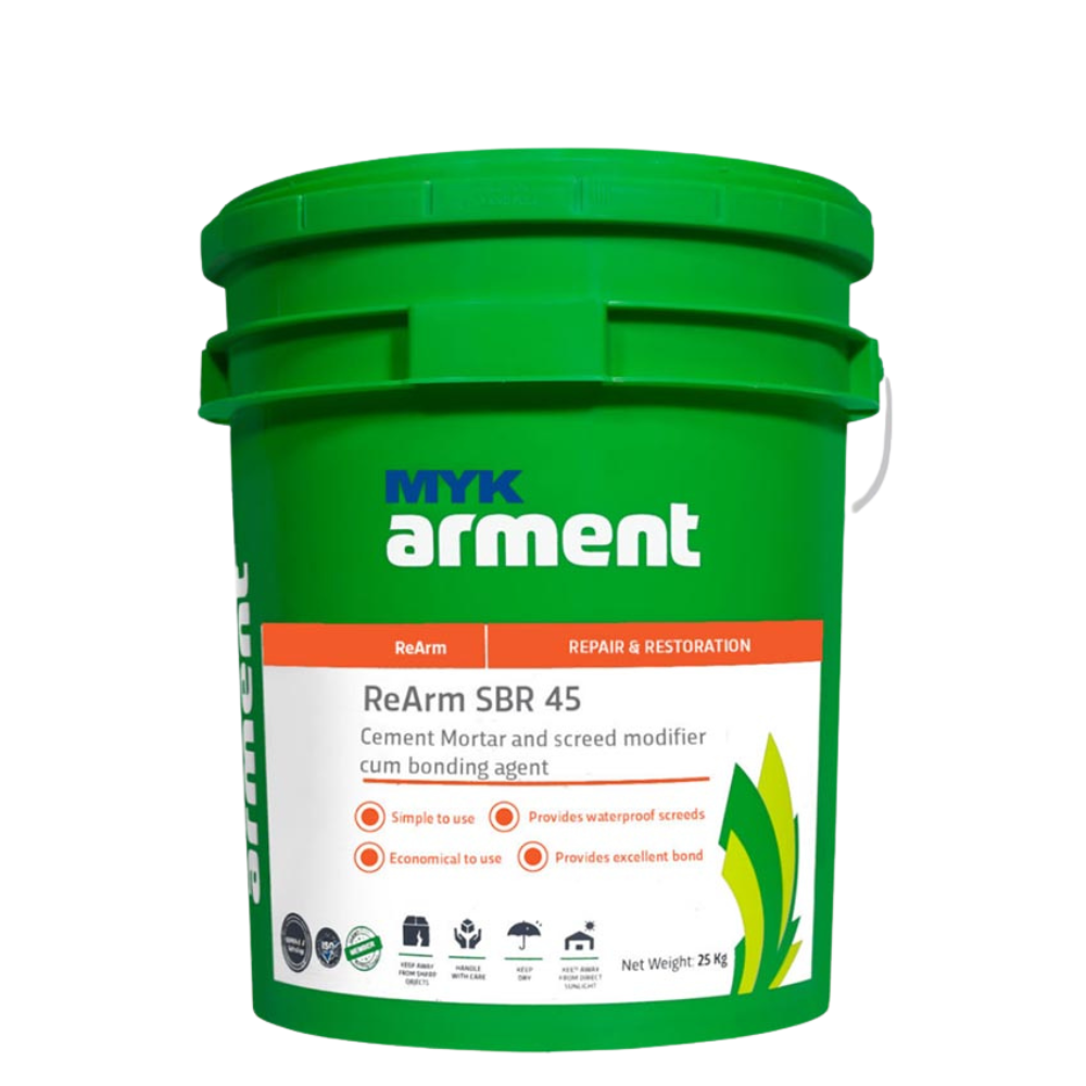 MYK Arment® ReArm SBR 45 is a modified Styrene Butadiene Rubber (SBR) emulsion designed for use as a bonding agent and cement mortar modifier.